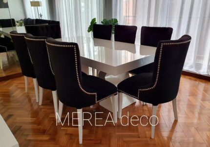 El precio original era: $ 3.325.000,00.$ 2.993.000,00El precio actual es: $ 2.993.000,00.Juego de Mesa Sofi 200 x 100 mts Brillante Pulido efecto cristal con 8 sillas London capitoné