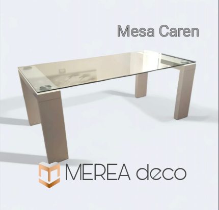 Mesa con bases Restoration y tapa minimalista laqueada con laca poliuretanica acabado Brillante Pulido efecto cristal.
