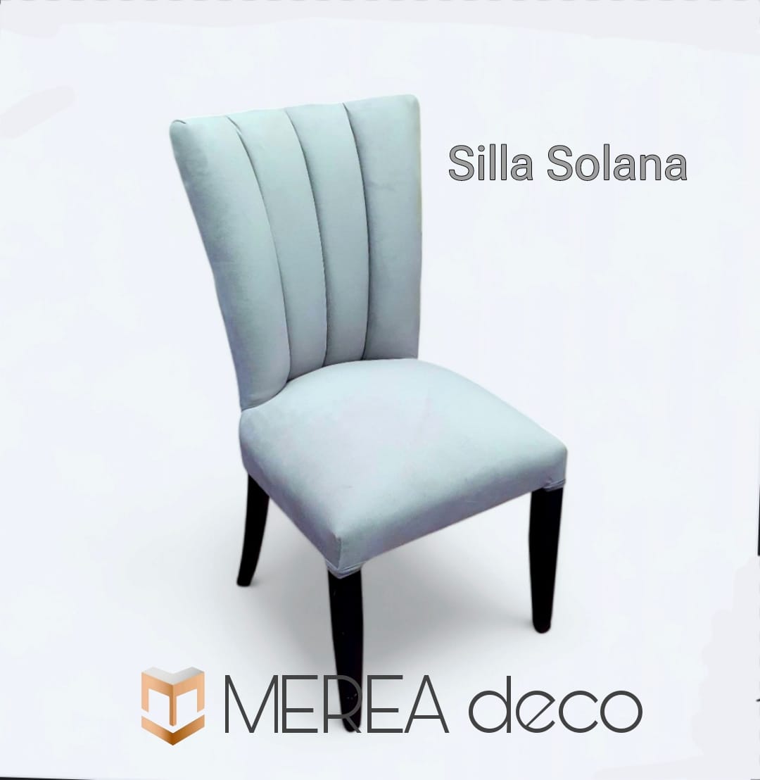 Silla Solana confeccionada en estructura de eucalipto macizo atornillada y encolada, con doble sincha y goma espuma de alta densidad placa soft, tapizadas en formato canelón en lino, pana, chenille, ecocuero talampaya o ecocuero gamuzado.